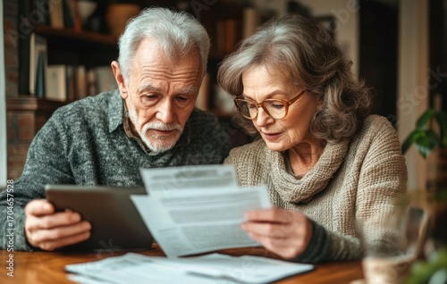 elderly couple closely reviewing paperwork and tablet together at home in a cozy setting with focused expressions