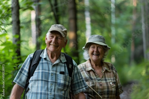 Elderly couple enjoying a peaceful walk through the forest, their smiles and relaxed postures reflecting the joy and serenity of retirement
