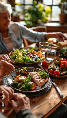 elderly, couple, alimentary, meal, salad, grilled chicken, cosy, natural light, dining, healthy living, wellness, vegetable, table, balanced diet, fresh, wholesome, lifestyle, sunflower, window, senior, well-being, nutritional, dining table, closeup