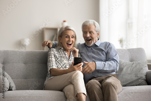 Elderly couple get sms with great unbelievable news about lottery win, pension increase, huge discounts, sell out good commercial offer, staring at cellphone screen with mouth opened feel very happy