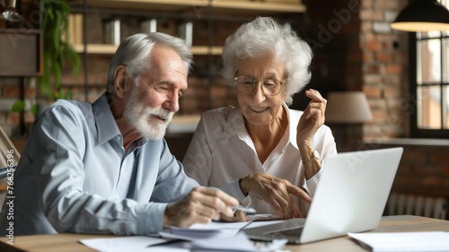 Elderly couple, old lady and man sitting together with a laptop and documents, discussing pension retirement plans, insurance, financial planning or vacation for seniors.