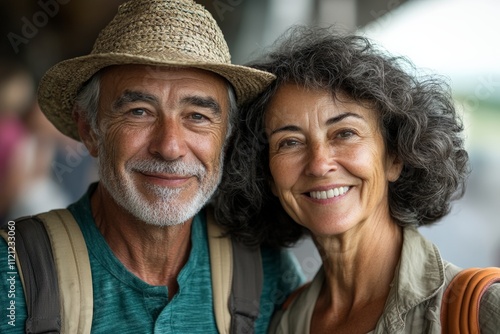 Elderly couple smiles together outdoors, showcasing joy and companionship in a vibrant setting