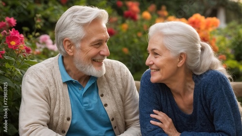 Elderly couple smiling together in the park, enjoying their retirement and the simple joys of life