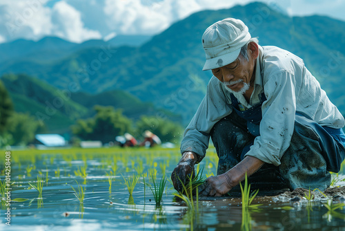 Elderly Farmer Planting Rice in Lush Green Fields Against Mountainous Backdrop on a Bright Day, Reflecting Traditional Agriculture in a Scenic Rural Landscape