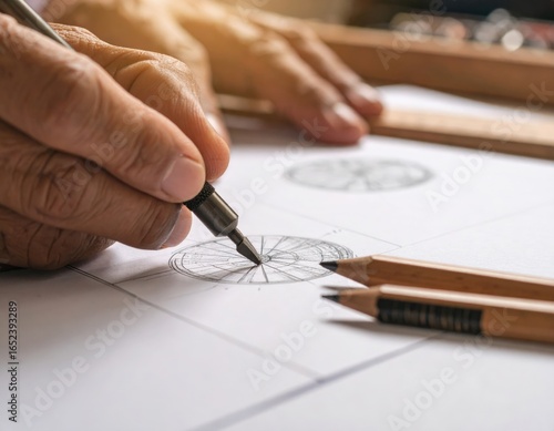 Elderly Hands Drawing Geometric Design With Pen And Pencils