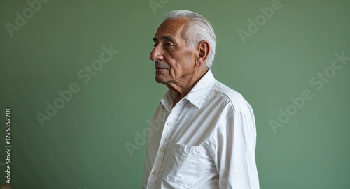 Elderly Hispanic man in plain green background white shirt side view portrait