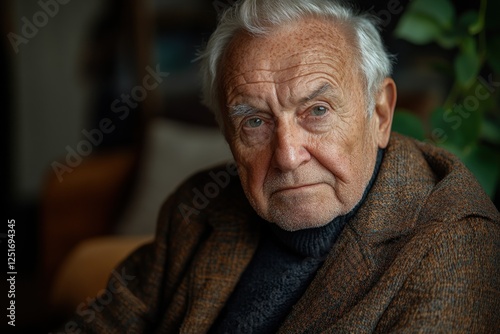 Elderly Man Experiencing Ear Pain at Home on Sofa with Thoughtful Expression and Grimace