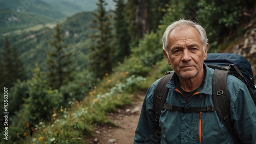 Elderly man hiking on a mountain trail. Middle-aged man hiking
