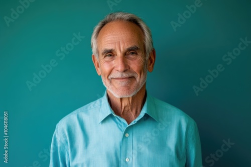 Elderly man in a dress shirt, smiling and looking directly at the camera, with a solid teal background and room for messaging