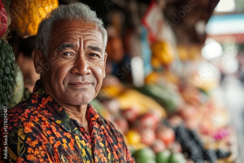 Elderly man in colorful shirt smiling at a vibrant fruit market in a tropical location during the morning hours