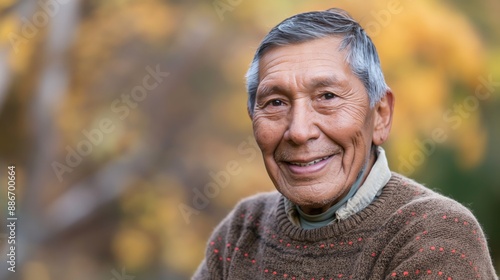 elderly, man, native, american, heritage, autumn, outdoors, smile, senior, portrait, photo, warmth, sweater, texture, detail, generational, wisdom, traditional, serene, peaceful, nature, fall, leaf, cultural, authenticity, dignity, life events, age, maturity, seasoned, background, closeup, person, expressive, landscape, foliage, calm, bequest, respectful, human, nostalgic, timeless, richness, connection, community, tribal, indigenous, storytelling, remembrance