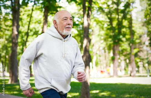Elderly man running in green park, copy space