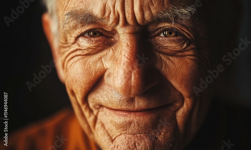 Elderly man smiling with deep gratitude, wrinkles telling a story of a well-lived life, eyes sparkling with wisdom and contentment, dramatic light, .