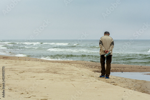 Elderly man walking on the shore of a sandy beach with beautiful rough grey sea with waves, dramatic cloudy grey sky in winter