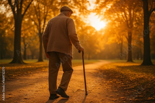 Elderly man walking with cane along autumn park path at golden sunset, independence and mobility support.