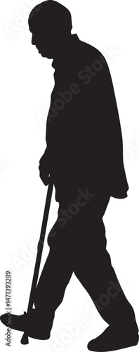 Elderly man walking with cane silhouette on white background