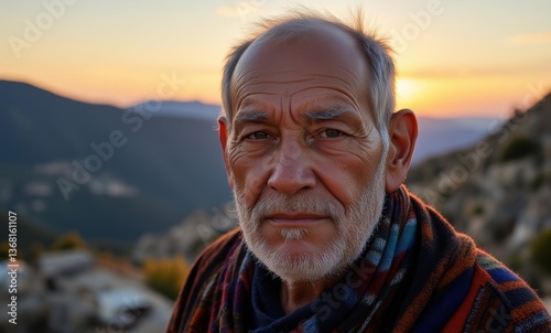 elderly, man, senior, sunset, landscape, rugged, portrait, nature, outdoors, scenic, serene, wrinkle, expression, wisdom, warm colors, travel, adventure, age, reflective, indigenous, cowboy, beard, foulard, mountain, peaceful, environment, candid, hair, mature, warmth, colourful, sky, horizon, natural light, weathered, background, closeup, detail, peace, character, authenticity, outback, rustic