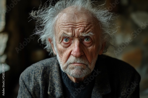 Elderly man with expressive eyes and disheveled hair gazes thoughtfully indoors during a quiet afternoon
