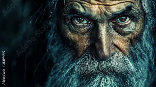 Elderly man with striking gray beard and piercing eyes, exuding wisdom and resilience.