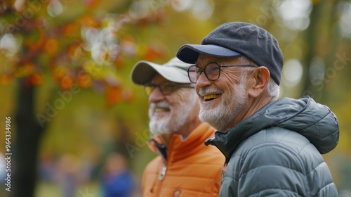 Elderly men enjoying outdoor activities in a park, promoting wellness and health through walking, exercise, and socializing with friends