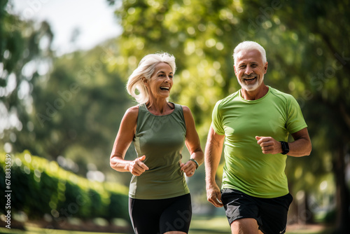Elderly old couple jogging in a park: Celebrating health and fitness in later life