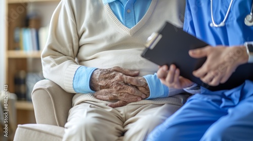 medicine, senior, hand, elderly, professional, meeting, nurse, people, health care, medicals, doctor, clinic, clipboard, home, holding, hospital, patient, health, indoor, care, support, sitting, stethoscope, interaction, uniform, therapy, service, lifestyle, trust, treatment, friendly, occupation, well-being, aged, consultation, caring, assistance, armchair, visit