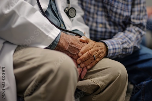 Elderly patient sitting with doctor in clinic, holding hands, close-up view. Concept of compassion in healthcare. Warm and supportive scene. Professional medical care setting. Generative AI