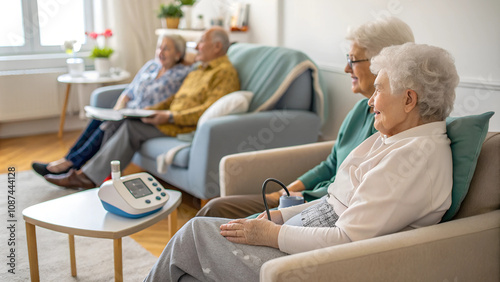 Elderly people sitting in a room with medical equipment and a blood pressure monitor nearby, showing the convenience of home health care services.