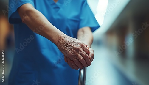 elderly, senior, old, age, ageing, walker, walking, hallway, hospital, health care, medicals, assistance, support, mobility, disability, health, care, rehabilitation, recovery, therapy, treatment, fragile, vulnerable, hand, wrinkle, skin, person, man, woman, patient, doctor, nurse, building, corridor, indoor, help, independence, freedom, life, living, future, community, well-being, longevity