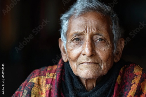 Elderly person with captivating expression wearing traditional clothing in an intimate indoor setting during the evening