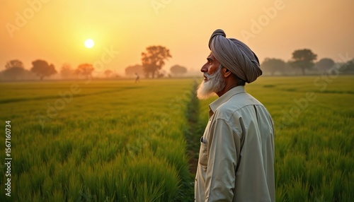 Elderly Punjabi farmer watches sunset over green field. Senior male with turban, white beard stands in golden hour. Rural landscape, peaceful scene, representing agriculture harvest, indian heritage.