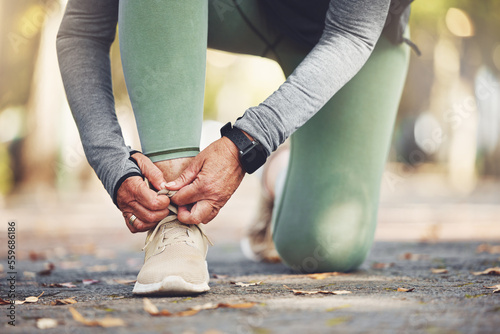 Elderly runner, hands and shoes for running, fitness in the park with exercise and start run with vitality. Body training, cardio and footwear, active lifestyle and sport outdoor with senior athlete