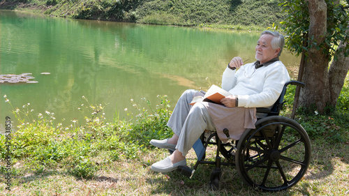 elderly senior gray-haired man in a wheelchair resting the body after receiving medical treatment in the park, Pensioners retirement concept