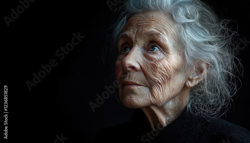 woman, elderly, old, aged, senior, face, portrait, wrinkle, skin, textured, grey, hair, white, eye, blue, gaze, pensive, thoughtful, looking, up, dark, background, black, shadow, light, contrast, expression, emotion, contemplation, wisdom, age, life, time, memory, year, life events, human, person, mystery, quiet, serene, solemn