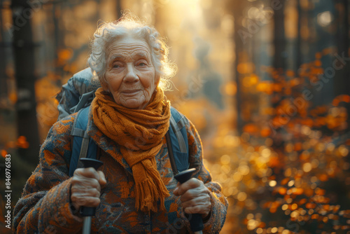 Elderly woman in cozy attire and a backpack hikes a forest trail in autumn, using walking poles. Physical activities and healthy lifestyle for retire people