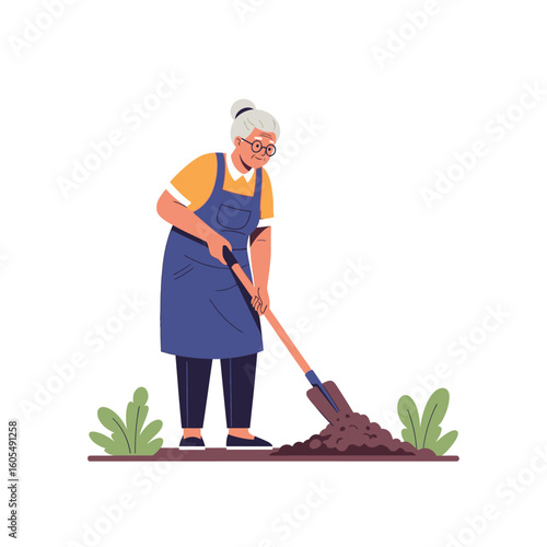 woman, elderly, senior, ageing, female, person, adult, garden, gardening, shovel, spade, digging, dirtied, ground, earth, plant, greenery, grass, apron, clothes, workwear, goggles, spectacle, bun, hair, grey, grey, white, wrinkle, skin, outdoors, activity, lifestyle, hobby, leisure, retirement, care, occupation, men at work, farm, farming, agriculture, cultivating, cultivation, growth, growing, nature, environment, vector