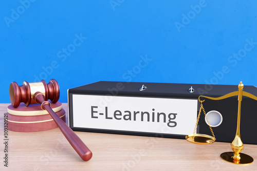 E-Learning – Folder with labeling, gavel and libra – law, judgement, lawyer