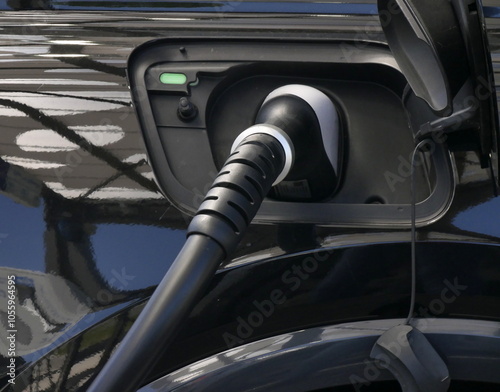 electric black car plugged to charge battery, close up of the plug. Clean energy, electric vehicle detail during recharge. sustainable transport