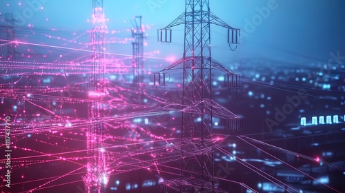 Electric Grid Network: Power Lines Illuminated in Neon Hues
