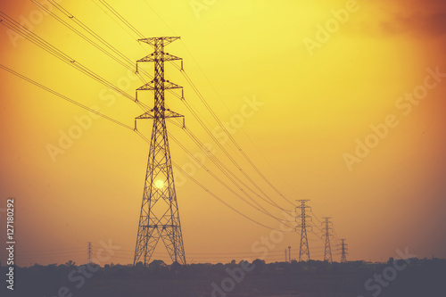 Electric high voltage power in the field with sunset background.Vintage or retro tone