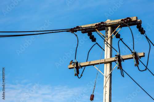 Electric Pole Power Lines And Wires With Blue Sky Background