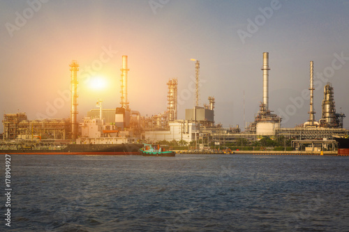electric power generating factory, industry plant, chemical storage tanks and sunlight of sunset at evening near the river