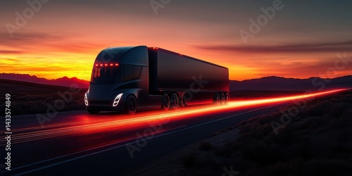 Electric truck driving away from the sunset leaving a trail of light symbolizing a sustainable future and advanced transport technology