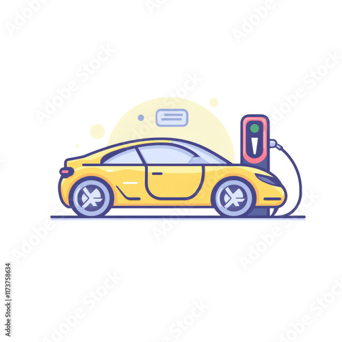 Electric vehicle charging at station, showcasing modern yellow car with charging cable. This illustration symbolizes shift towards sustainable transportation