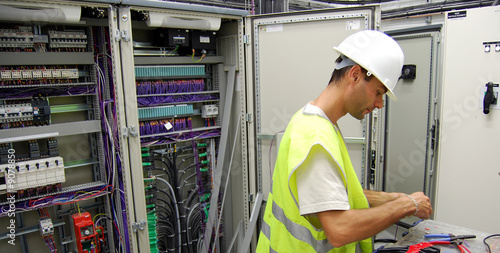 electrician, electricity, automatism, industry, industrialist, factory, cable, craft, volt, amper, cable, connection, tool, breaker, son, boundary, work, man, vest, yellow, helmet, security