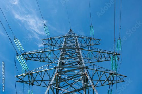 Electricity transmission pylon on blue sky background. High voltage post or high voltage tower. Concept of electricity and energy.