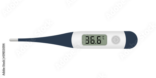 electronic medical thermometer 3d Celsius for measuring kit close-up. Normal 36.6. Digital thermometer design template showing temperature. View from above. Vector illustration