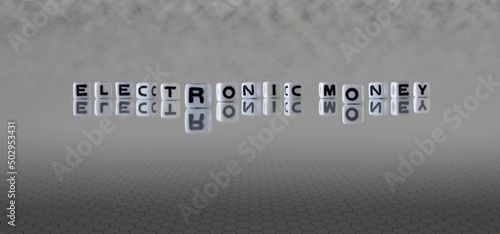 electronic money word or concept represented by black and white letter cubes on a grey horizon background stretching to infinity