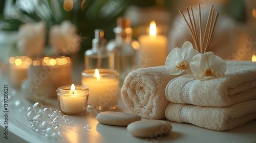 Elegance is embodied in this spa setup, which features candles, towels, orchids, and aroma sticks