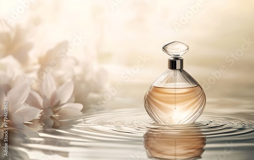 Elegance Reflected: Sculpted Glass Perfume Bottle in Champagne Cream Palette on Water. Product Photography with Photorealistic Effect.